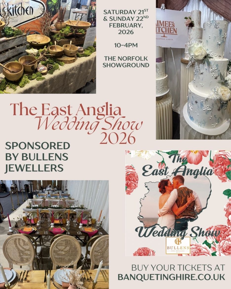 closeSAVE THE DATE! THE EAST ANGLIA WEDDING SHOW 2026 The biggest Two-day wedding show in Norfolk and Suffolk will be back at the Norfolk Showground & Events Centre on Saturday 21st and Sunday 22nd February, 2026. With over 100 Exhibitors, there is so much choice for you to come and see and chat with these very talented wedding suppliers about your big day! 10 a.m. to 4 p.m. Brought to you by The Banqueting Hire Service and once again our […]