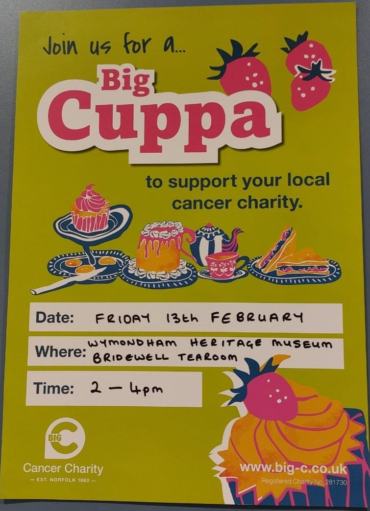 Have you missed us?? Come and join us in the Bridewell Tearoom at Wymondham Heritage Museum on 13th February for a slice of homemade cake and a cuppa in support of Big C Cancer Charity - it'll give you a taste of what's to come when we officially open on Monday 9th March.
