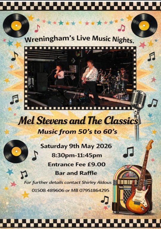 Wreningham's Live Music Nights next dance is with Mel Stevens and The Classics Now taking bookings If you would like seats reserved please contact Shirley on the numbers on the poster, message or just turn up on the night. ...thank you!