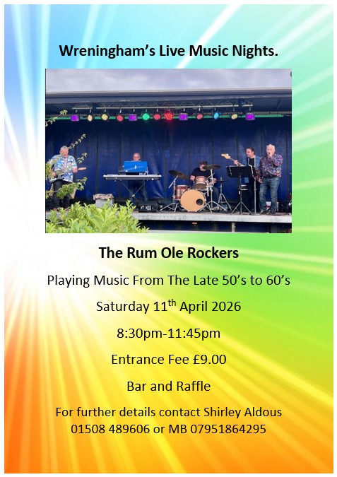 On Saturday April 11th we have The Rum Ole Rockers playing at Wreningham Village Hall. So grab your dancing shoes and come and have a night out or just come and listen and have a social night out. A very warm welcome awaits. If you would like seats reserved please make contact on the numbers shown on the poster.