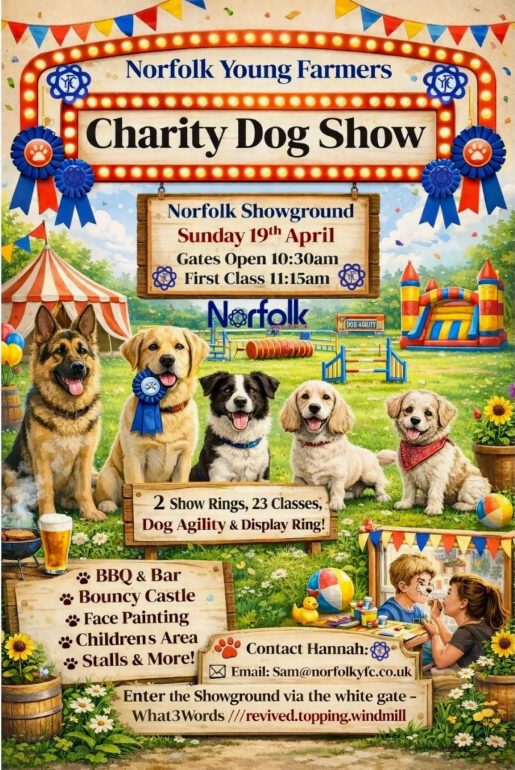 The countdown is on for our Dog Show, join us next week for a whole day of fun with your furry friends Two Show rings, 23 Classes, Dog Agility BBQ, Bar, Bake Sale, Bouncy Castle, Children's Area, Dog Agility, Stall Holders, Raffle, Photographer, Face Painting & so much more! Royal Norfolk Showground Enter via the WHITE GATE What3Words ///revived.topping.windmill Sunday 19th April 2026 Gates Open: 10:30am First Class 11:15am Raising Funds For Norfolk Young Farmers