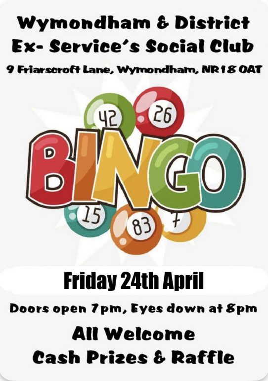 • Cash Bingo – Wymondham & District Ex-Services Club, 24th April