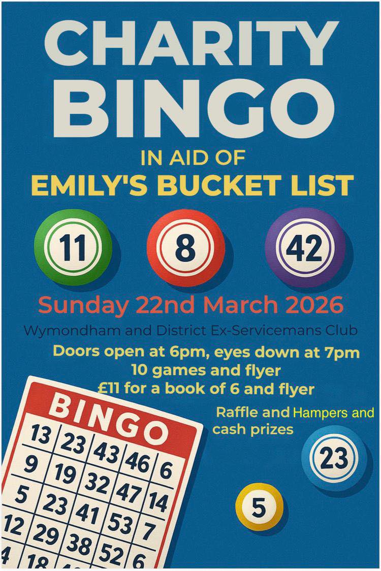 Come and join us for a Charity Bingo night in the Regal Lounge, at Wymondham Ex-Services Social Club, on Sunday 22nd March.