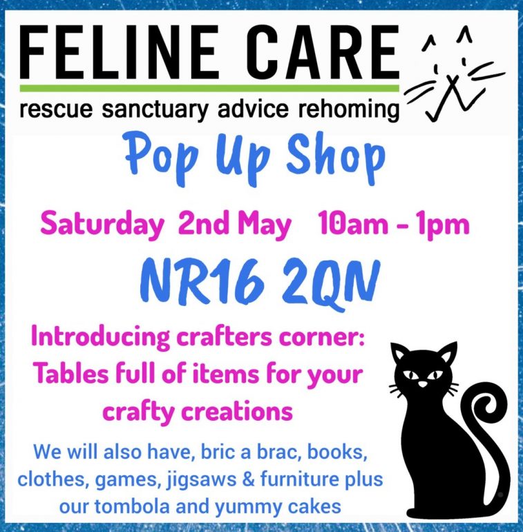 Pop Up Shop in the car park at Feline Care Cat Rescue, NR16 2QN, Saturday 2nd May, 10am - 1pm All of our usual goodies;Clothes £1 per itemBric a brac 50p an itemBooks 50p eachJigsaws & games £1 each Plus Crafters Corner for all the crafty people out there We will also have our amazing tombola and tasty cakes. Onsite parking available All money raised supports Feline Care Cats